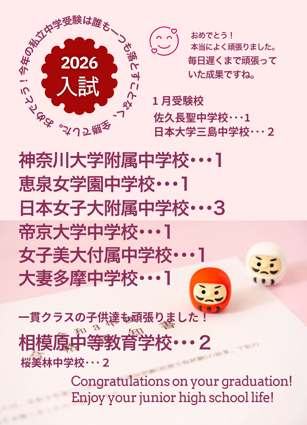 本日相模原中等教育学校の発表日! スタッフのつぶやき 2026.02.10 本日は 相模原中等教育学校 の発表日です。 一貫クラスの子供達も本当によく頑張りました。 私立受験コースも中高一貫コースも小人数だけど、 小人数だからこそ一人一人の課題を明確に伸ばす ことが出来ると思っています。 毎年素敵な笑顔をありがとう!
