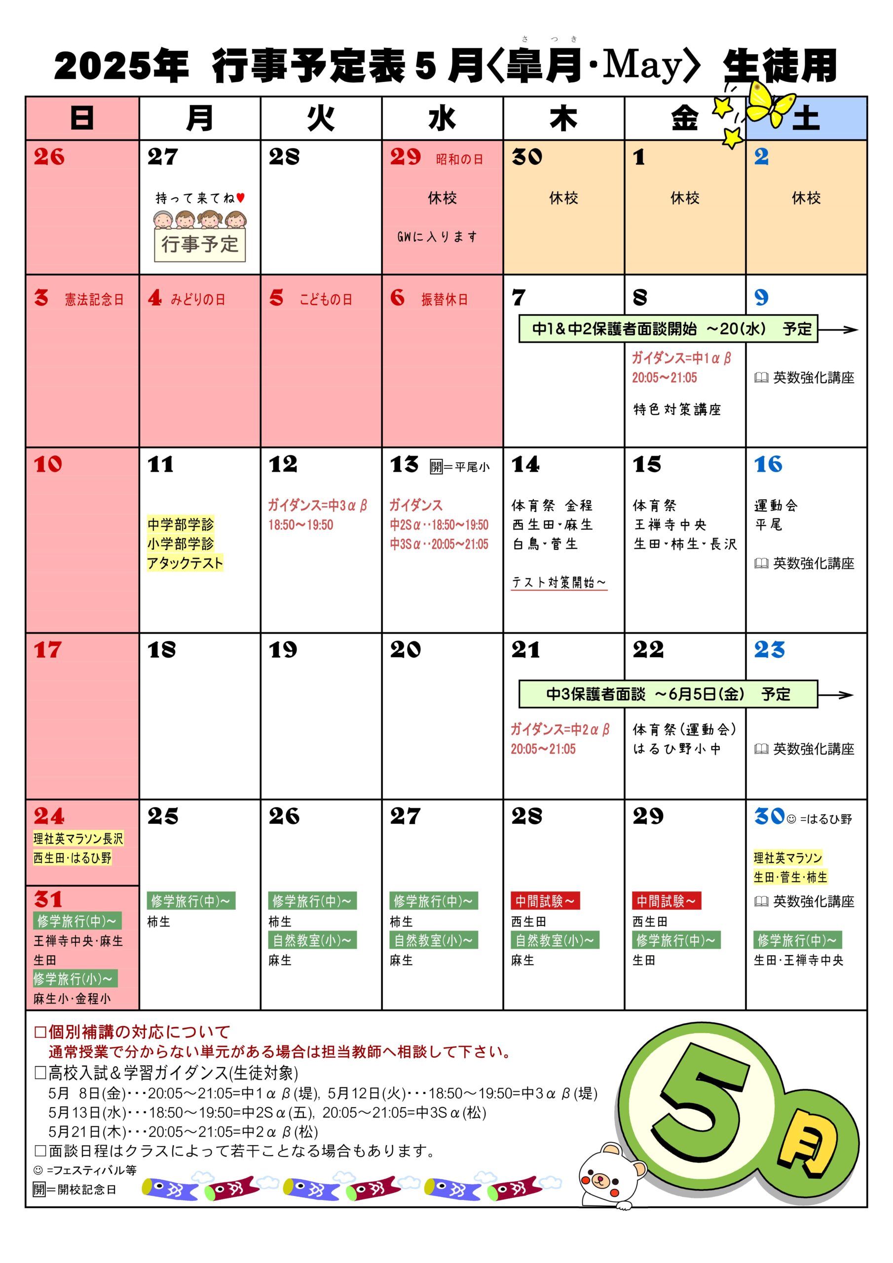 5月の行事予定表 今月の行事予定表 2026.04.20 5月6月は行事が盛りだくさんです。慌てることがないようにしっかり確認をしましょう! PDFでご覧になりたい方は→こちらをクリック 5月行事予定表